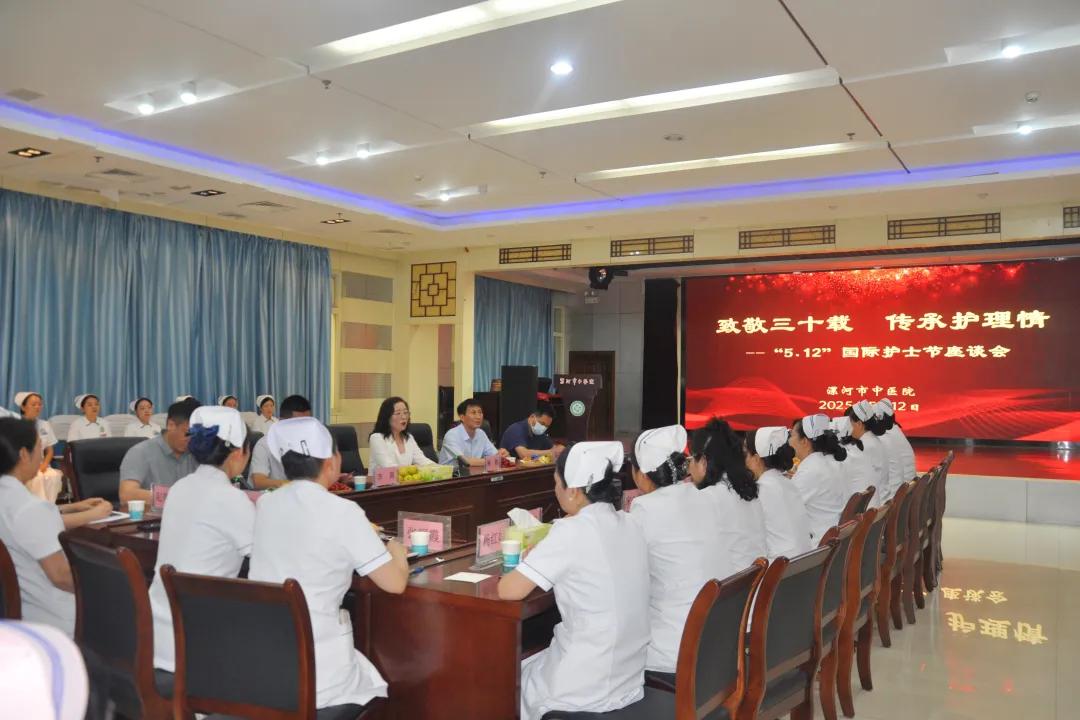 當日下午,漯河市中醫院護理部組織召開了“致敬三十載 傳承護理情”為主題的護士節座談會。會議由副院長閆丙川主持,楊軼及院領導班子成員出席并講話,13名三十年護齡護理人員、各科室護士長及優秀護士70余人參加。