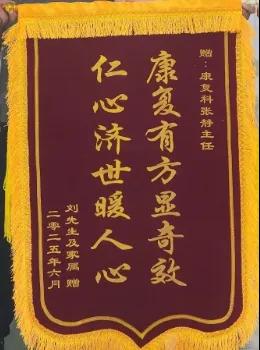 與此同時,科室還收到一面印有“康復有方顯奇效,仁心濟世暖人心”字樣的錦旗。在患病期間,患者飽受腰痛、下肢麻木等癥狀折磨,嚴重影響日常生活。來到康復科后,科室負責人張靜帶領科室團隊根據其病情制定個性化針灸治療方案,通過精準取穴、規范施針,配合專業康復指導,逐步減輕患者病痛,助其恢復正常生活?;颊邽楸砀屑?,特贈錦旗,錦旗上的話語是對科室治療效果的高度認可。