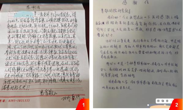 另一封感謝信來自因腰疼住院的患者,信中感謝了護士長田智慧和護士曹玲。治療期間,兩位護理人員將專業、細致的服務貫穿始終。從日??祻妥o理操作到患者心理疏導,她們始終保持高度的責任心,耐心解答疑問、貼心安撫情緒,用暖心服務助力患者身心康復,贏得患者由衷的信賴與感激。