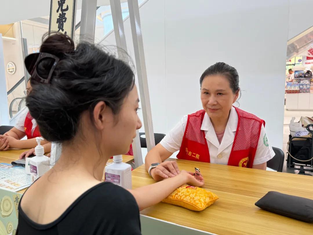 活動現場,市二院中醫針灸科精心設置了中醫把脈、中醫養生茶,耳穴壓豆,刮痧,火龍罐,艾灸,AI把脈,香囊展示,中藥材展示,測血壓等多個義診攤位,由10余名資深中醫專家組成的志愿服務團隊“坐鎮”,與市民群眾面對面交流,針對檢查中發現的問題,為群眾提供疾病防治建議、健康管理方案,給出針對性的預防和診療建議。