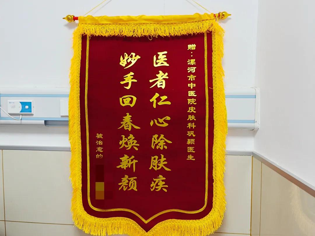 近日,漯河市中醫院皮膚科鞏潁醫生收到病人感謝的錦旗,上面寫著“醫者仁心除膚疾,妙手回春煥新顏”,短短文字表達對醫生醫術的認可與自己頭發重新生長的喜悅。