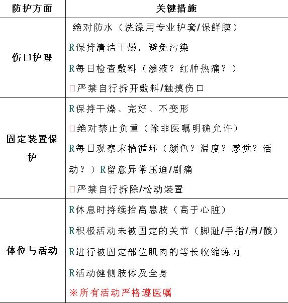骨折術后拆線前的階段(通常為術后7-14天)是傷口愈合和早期穩定的關鍵時期,特別是未拆線出院的患者做好自我防護至關重要,能有效預防感染、促進愈合、避免并發癥。以下是詳細的自我防護清單: