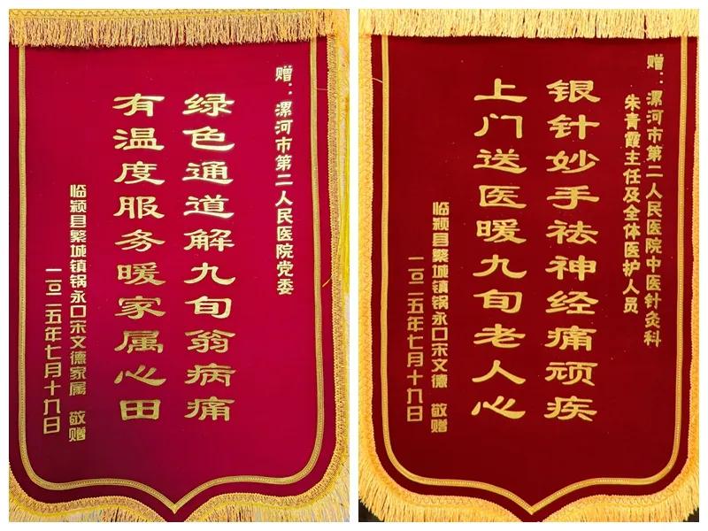 7月20日上午,市二院門診大廳暖意融融,92歲宋老先生的家屬手捧兩面錦旗,專程向醫院黨委和中醫針灸科表達最誠摯的謝意。副院長劉橋受院黨委委托與全國先進工作者、全國“五一”勞動獎章獲得者、中醫針灸科主任朱青霞及科室團隊熱情接待了家屬,并鄭重接過了這份沉甸甸的心意。