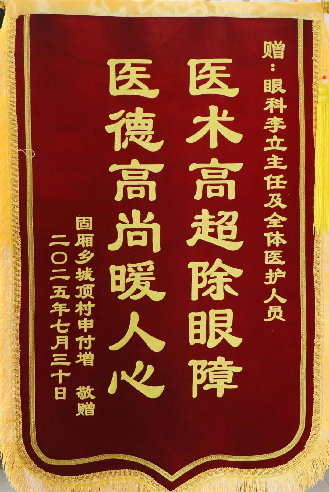 7月30日上午,臨潁縣固廂鄉城頂村黨支部書記楊勝武和該村申大爺家屬滿面笑容地將一面寫著“醫術高超除眼障,醫德高尚暖人心”的錦旗送到了市二院眼科病區。