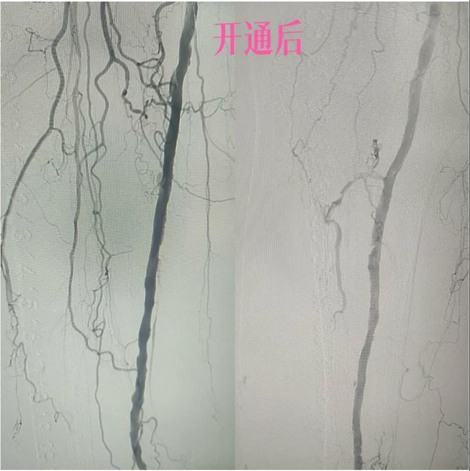4. 即刻“見證”:再次造影顯示,原本狹窄閉塞的血管段血流恢復通暢!足部遠端血管顯影較前明顯改善。手術過程順利,患者靜息痛較前明顯改善。