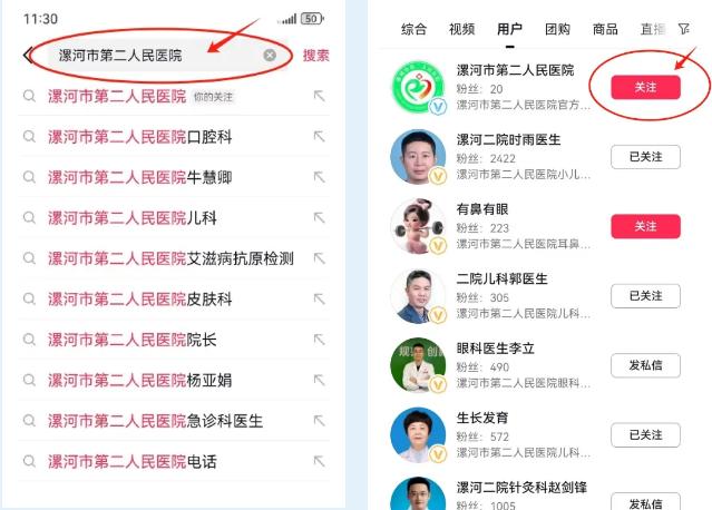 用戶名“漯河市第二人民醫院”或者抖音賬號71780395553