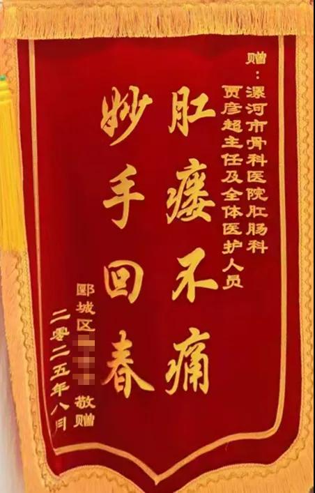 近日,在漯河醫專二附院(漯河市骨科醫院、漯河市立醫院)肛腸科,患者將一面寫有“肛瘺不痛,妙手回春”的錦旗送到了賈彥超主任手中,以此表達她對賈主任及其醫療團隊精湛醫術和貼心關懷的誠摯感謝。這面錦旗背后,是一段患者重獲健康、擺脫病痛折磨的暖心歷程。