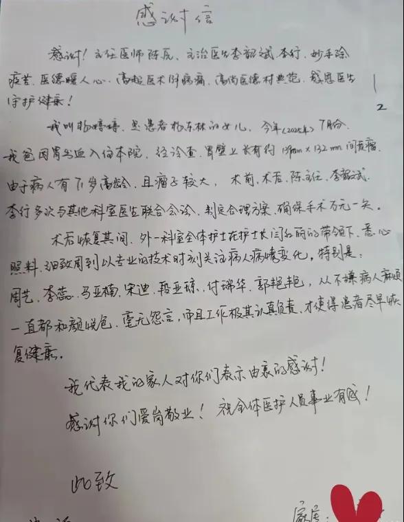 這封感謝信,是對普通外科全體醫護人員,尤其是對護理團隊辛勤付出和專業精神的高度認可與鼓勵。對團隊而言,患者的康復和家屬的滿意是他們最大的追求。普通外科團隊將繼續秉承“以患者為中心”的服務理念,不斷精進醫療技術,提升護理服務質量,尤其是加強復雜、高齡患者圍手術期的精細化、人性化護理管理,用精湛的醫術祛除病痛,用溫暖的仁心守護健康,為更多患者帶來康復的希望和家的溫暖。(盧 闖 閆紅麗 劉 旭 袁錦鈺)