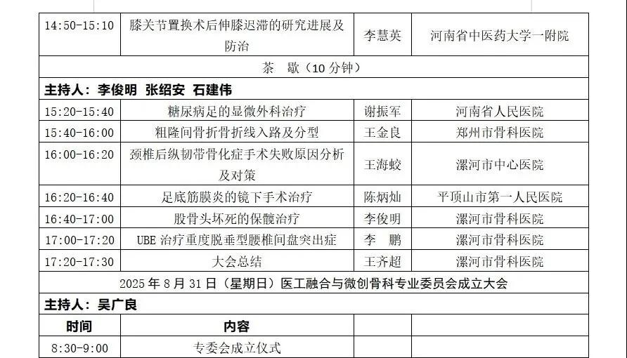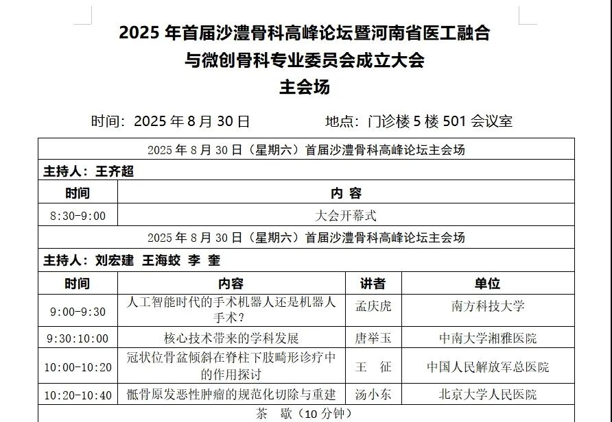 為進一步推動河南省醫工融合與微創骨科領域的創新發展,加速實現診療流程的規范化與精準化,助力業內同仁及時掌握國內外該領域前沿動態,深入學習新理念、新知識和新技術,經醫工融合與微創骨科專業委員會籌備組審慎研討,現定于2025年8月30日-31日在漯河召開首屆沙澧骨科高峰論壇暨河南省物理醫學學會醫工融合與微創骨科專業委員會成立大會。誠邀國內外骨科領域專家學者齊聚漯河,共探學術前沿、共話發展機遇、共繪學科新藍圖?,F將會議相關事宜通知如下: