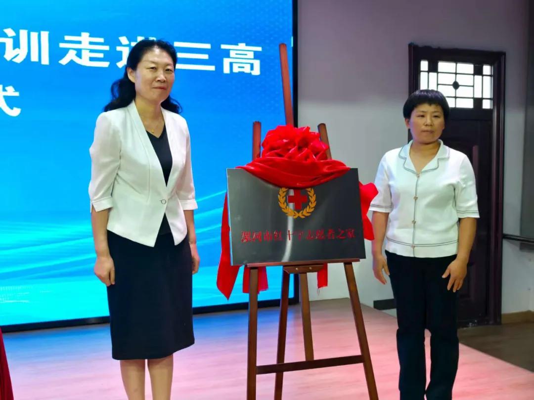 現場,郭俊偉向“漯河市第三高級中學紅十字應急救護社團”代表授旗,孫潁華和胡海英共同為“紅十字志愿者之家”揭牌。