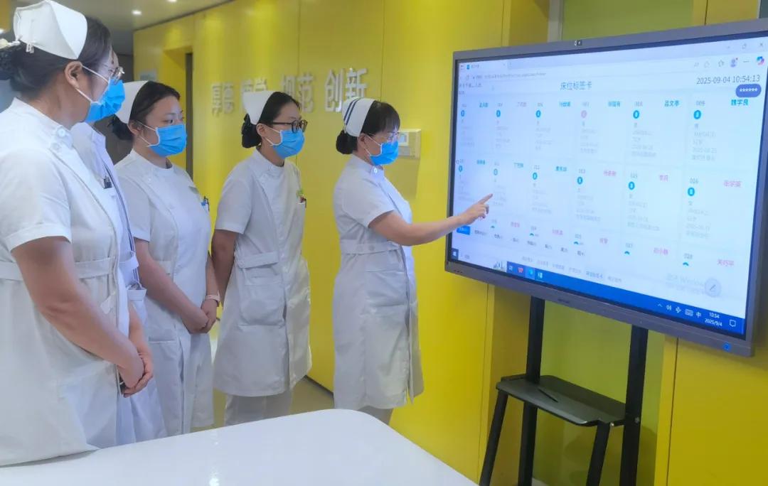 護士站前,一場交班會正在進行:智慧大屏上,患者信息實時更新,護理內容分類顯示,重點項目一屏盡覽。告別傳統手寫白板,降低人工轉抄差錯,大家通過點擊和切換不同場景,共同了解當天的工作安排及注意事項。同時,互動大屏可以播放宣教資料,進一步豐富健康教育形式。