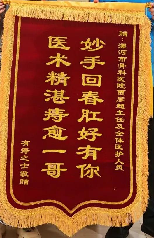 近日,漯河醫專二附院(漯河市骨科醫院、漯河市立醫院)肛腸科收到一面滿載心意的錦旗?;颊呶罩Z彥超主任的手再三致謝,錦旗上“妙手回春肛好有你,醫術精湛痔愈一哥”十六個大字,既是對醫護人員專業能力的肯定,更是對肛腸科中西醫結合診療水平的認可。