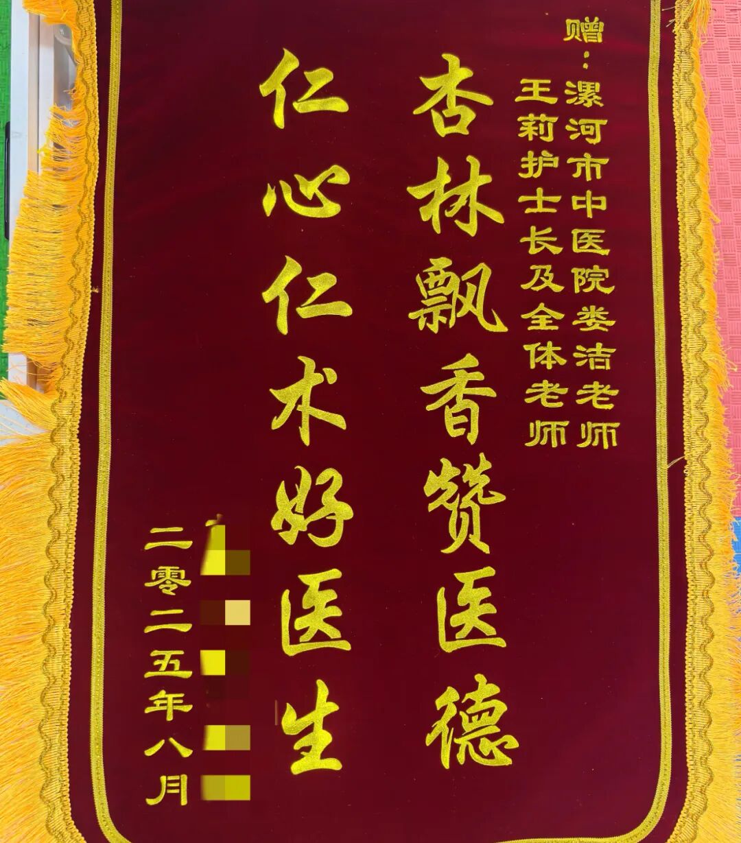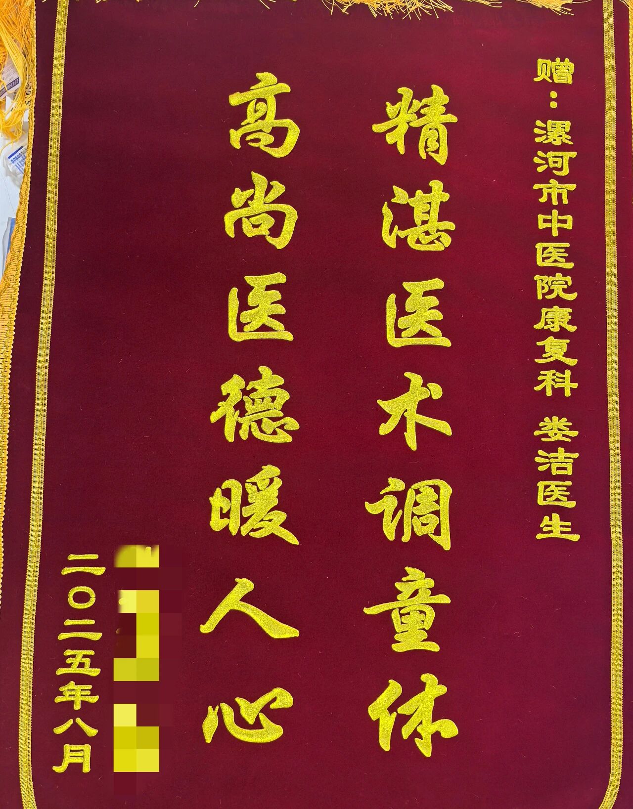 近日,漯河市中醫院兒童康復科收到患兒家屬贈送的兩面錦旗,分別寫有 “杏林飄香贊醫德,仁心仁術好醫生”“精湛醫囑調童體,高尚醫德暖人心”。家屬以此表達對婁潔醫生、王莉護士長及治療師精湛技術和優質服務的肯定與感謝。