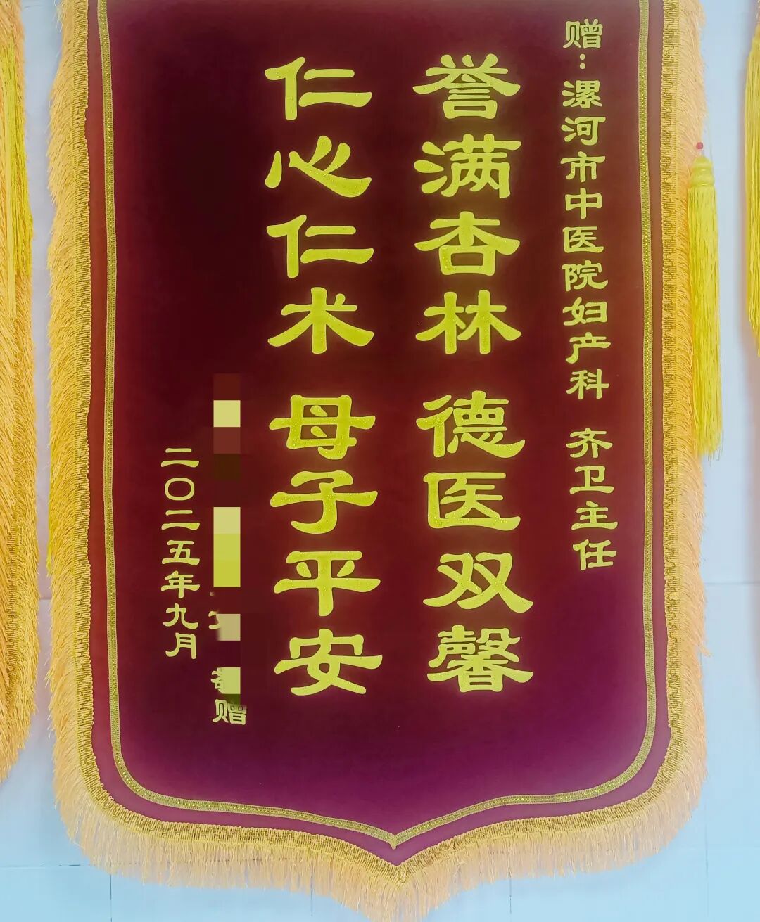 近日,漯河市中醫院婦產科再現溫馨一幕:一位二胎媽媽攜家屬專程返回醫院,將一面寫有“譽滿杏林,德醫雙馨,仁心仁術,母子平安”的錦旗送至婦產科主任齊衛手中,以此感謝分娩期間得到的專業救治與溫暖關懷。