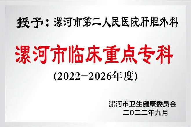 漯河市第二人民醫院普外科含肝膽外科、燒傷科、泌尿外科、微創外科、普外科。其中肝膽外科為漯河市醫學重點???,擁有普通病床46張,重癥監護病床5張,該科技術力量雄厚,現有主任醫師3人,副主任醫師2人,住院醫師3人,副主任護師1人,其中碩士研究生2名??剖蚁群髽s獲河南省衛生廳科技成果獎4項,漯河市科技成果獎30余項,其中一等獎8項。分別和火箭軍總醫院、上海東方肝膽外科醫院、河南省人民醫院肝膽外科等建立診療聯盟單位,定期邀請知名專家來院義診及手術,能為漯河市及周邊地區的病人提供優質的醫療服務。