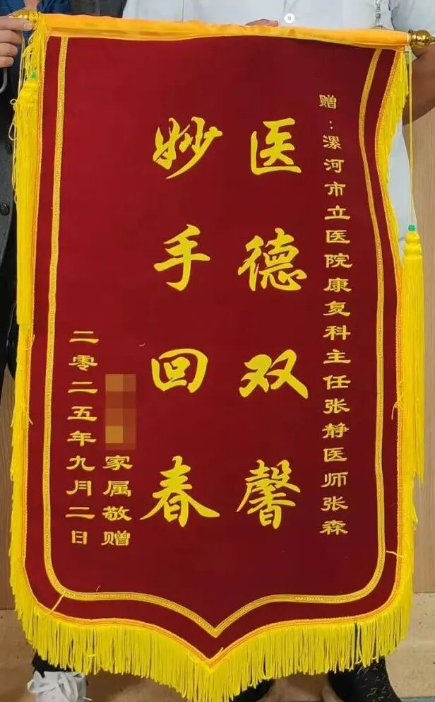 “醫德雙馨,妙手回春”——這面沉甸甸的錦旗,被患者鄭重地送到了漯河醫專二附院(漯河市骨科醫院、漯河市立醫院)康復醫學科張森醫生手中 ,這是患者對張醫生真摯的肯定,更是一段從絕望到重生的康復之路的見證。 一個半月前,患者因偏癱陷入困境:左側肢體完全活動不利,神志不清、胡言譫語,溝通障礙,記憶功能受損,生活無法自理??祻歪t學科團隊立即制定個性化方案,中西醫結合開啟康復征程。