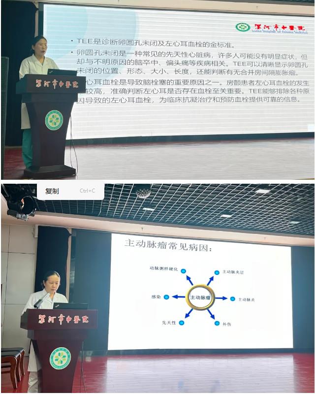 本次活動特別邀請超聲科專家團隊現場授課,其中副主任醫師許淑君、王珂,副主任技師劉慧,主治醫師郭亞蘭及住院醫師付豪分別主講,內容圍繞五大核心板塊展開:經食道超聲心動圖的臨床應用、經食道超聲心動圖指南解讀、人工瓣置換術后的超聲評估、心臟瓣膜病的超聲診斷,以及主動脈疾病的超聲診斷。
