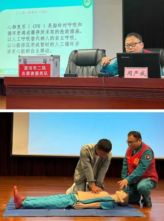 隨后,急診科副主任醫師周嚴威圍繞《應急急救技能實操》進行專題講解與現場演示,重點聚焦海姆立克急救法與心肺復蘇術兩大關鍵技能。為讓職工更直觀掌握動作要領,周嚴威副主任醫師使用人體模型進行多輪演示,同時邀請現場職工上臺實操練習,確保每位參與實操的職工都能規范掌握核心步驟。
