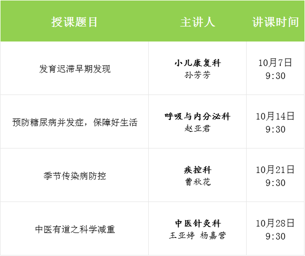 金秋10月,秋高氣爽,正是關注健康的好時節!為更好地服務廣大患者和居民朋友,普及健康知識,市二院門診部將繼續于10月份開展“門診健康科普周周講”系列活動。每周固定時間在門診樓一樓大廳觀影區域,由醫院各科室專家帶來實用、易懂的疾病防治和保健知識分享,內容貼近生活,講解通俗易懂,希望您和家人在就診之余,獲得實用的健康資訊。敬請留意講座預告!