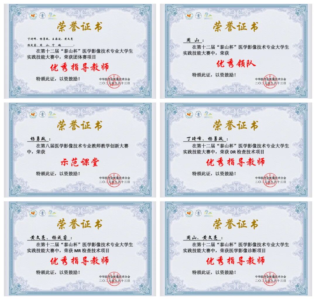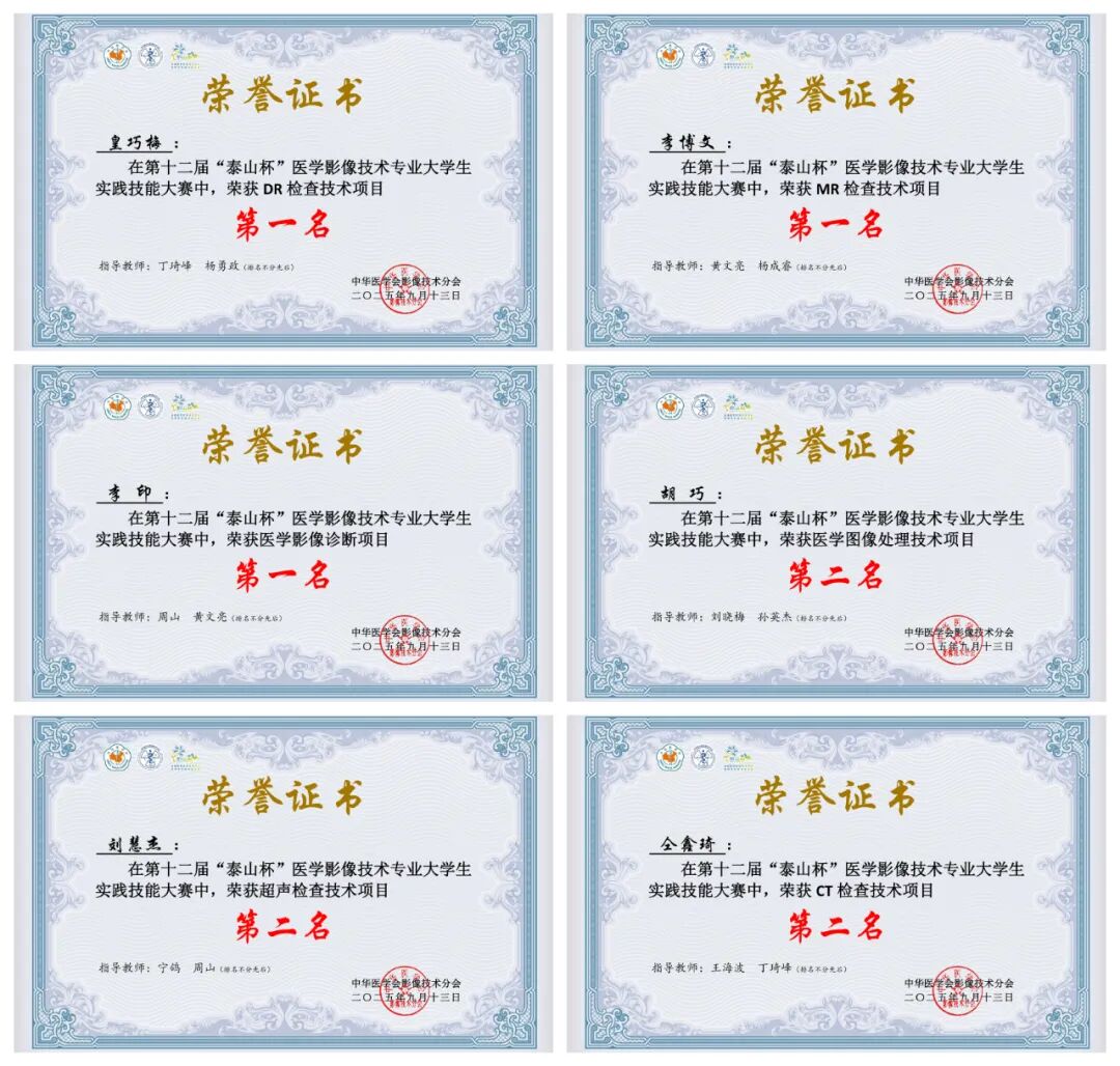 其中學生皇巧梅、李博文、李印分別榮獲DR、MRI檢查技術項目和醫學影像診斷項目第一名,劉慧杰、仝鑫琦、胡巧同學分別榮獲超聲、CT檢查技術和醫學圖像處理項目第二名,楊勇政老師在教師教學比賽中榮獲優秀創新大賽示范課堂,最終參賽團隊以優異的綜合成績摘得團體項目競賽第一名的桂冠,優秀的成績贏得了大賽評委和參賽同道的廣泛贊譽。這也是繼2018年首次參加該賽事以來,漯河醫專二附院醫學影像教學團隊取得的又一優異成績。