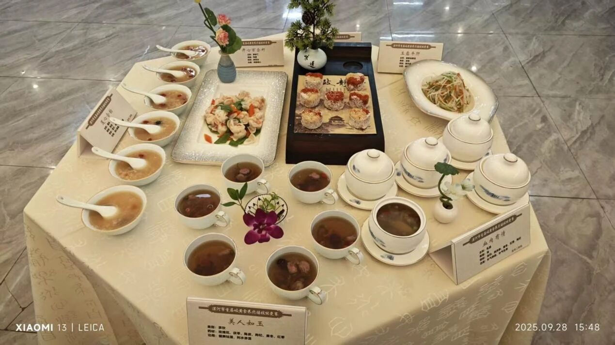 經過激烈角逐,團隊憑借“開心百合蝦”“玉芝云糕”“玉露平肝”“血肉有情”“美人如玉”等一系列兼具養生功效與美味口感的藥膳作品(如圖中展示的精美藥膳,涵蓋熱菜、涼菜、面點、湯品、茶飲等多種類型),從眾多參賽隊伍中脫穎而出,成功斬獲團體二等獎,與漯河技師學院共享這一榮譽,充分彰顯了醫院在食養藥膳領域的綜合實力。
