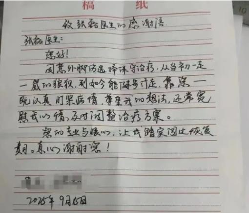 就這樣,在專業治療與耐心陪伴下,患者的腳踝一天天好轉:從最初只能緩慢行走,到后來能正常上下樓梯,再到如今可以輕松散步——曾經讓患者困擾不已的“老大難”問題,終于徹底解決。出院那天,患者特意手寫了這封感謝信,字里行間滿是真誠:“張醫生不僅治好了我的疼痛,更撫平了我心里的焦慮,這樣的好醫生,值得我們真心感謝!”