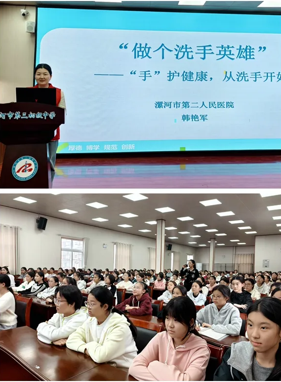 此外,市二院感控辦工作人員專程走進市第三初級中學,為學生們帶來了一場別開生面的手衛生知識講座。工作人員以“手”護健康為切入點,通過專題講座、播放宣傳視頻、講解洗手重要性、演示“七步洗手法”等環節,深入淺出地向同學們闡述了洗手這一最簡單、經濟且有效的健康守護方法,有效提升了青少年群體的手衛生知識與自我防護能力。