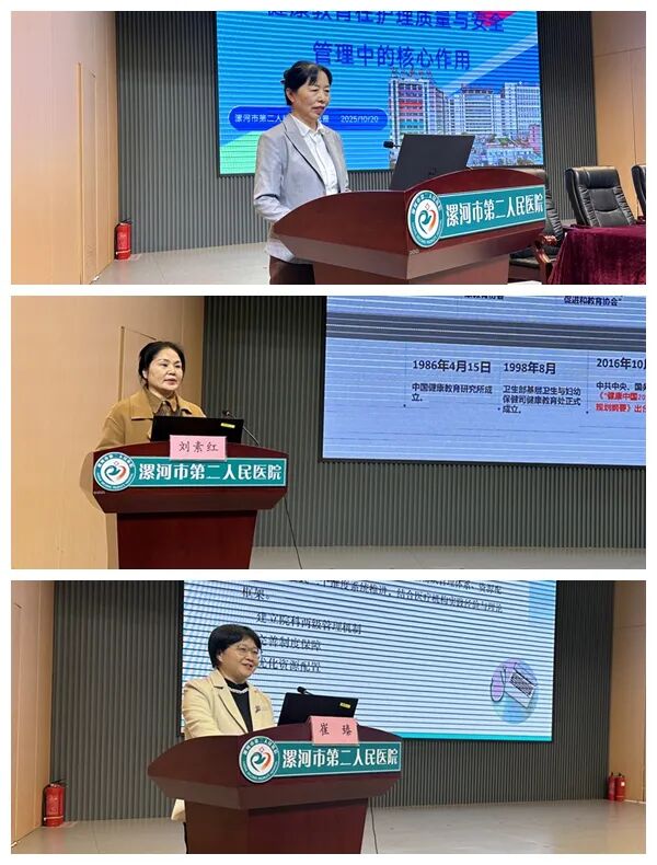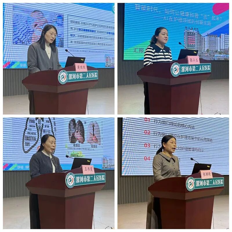 在學術交流環節,多位護理專家圍繞健康教育的新理念、新方法與新技術展開深入探討。市二院護理部主任高凱霞分享了《健康教育在護理質量與安全管理中的核心作用》;市中心醫院護理部副主任劉素紅講解了《基于賦能理論構建三級醫院健康教育護士健康素養提升路徑》;市六院護理部副主任崔臻以《賦能·融合——構建新時代醫院護理健康教育體系的實踐與思考》為題進行交流;臨潁縣人民醫院護理部副主任張潁歌介紹了《基于行為窗口理論的護士高效能溝通技巧》;市二院普外科護士長王書霞圍繞《腫瘤患者營養與身心健康:吃出健康,動出活力》展開講解;麻醉手術部副護士長莫敬敬探討了《基于指南的靜脈治療健康教育及溝通模式》;小兒外科骨干護士張小玉則就《智能時代,如何讓健康科普“活”起來?——AI在護理領域的創新實踐》進行分享。專家們結合臨床實例,展示了健康教育的最新成果與實踐經驗,內容充實,視角多元,為參會者帶來深刻啟發。