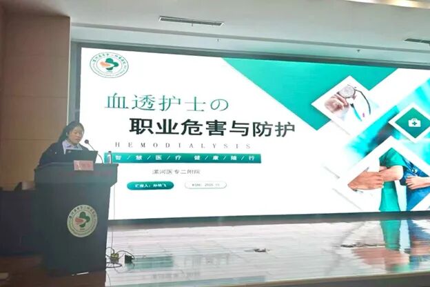 漯河醫專二附院血液凈化室骨干孫艷飛圍繞《血透護士的職業危害與防護》展開講解,從各個層面系統梳理了血透護士面臨的職業風險,并提出了具體、可行的防護措施與建議,呼吁在全力關愛患者的同時,務必重視自身的職業安全與身心健康,體現了深刻的人文關懷精神和團隊管理智慧。由臨潁縣中醫院血液凈化室護士長陳莉與舞陽縣中醫院血液凈化室護士長張銳主持會議。