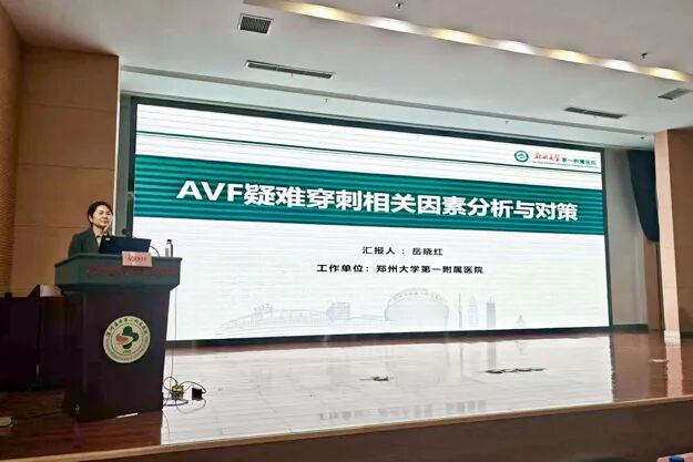 中華護理學會血液凈化專業委員會委員、鄭州大學第一附屬醫院血液凈化中心護士長岳曉紅以《AVF疑難穿刺相關因素分析與對策》為題,從精準評估、穿刺、超聲輔助、團隊協作幾個方面,分析了動靜脈內瘺穿刺困難的各類因素,分享了一系列實用、有效的解決方案。由漯河市第二人民醫院血液凈化室護士長朱潔與舞陽縣人民醫院血液凈化室護士長苗保紅主持會議。
