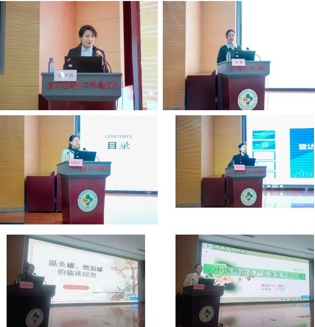 授課環節,漯河醫專二附院康復科主任張靜、漯河市中醫院婦產科主治中醫師位路其,高級講師李少瑩,漯河醫專二附院婦產科助產士王夢麗、婦產科副主任中醫師王偉偉,分別就《產后病的中醫治療》《中藥外治法在產后腹痛中的臨床應用》《雷達技術在盆底診療中的應用》《溫灸罐與燃脂罐臨床應用》《中醫外治在產后康復中的臨床應用》等內容進行分享。