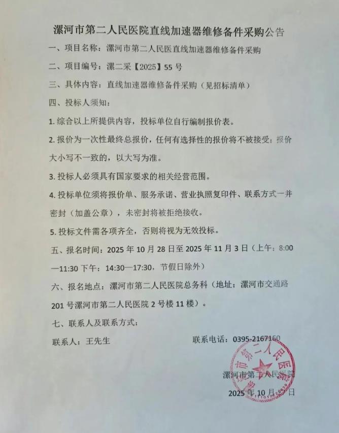 漯河市第二人民醫院直線加速器維修備件采購公告__新聞頻道——漯河網-漯河市委、市政府唯一重點新聞門戶網