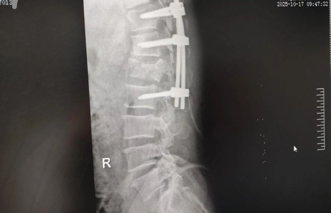 針對腰椎傷情,骨科竇志剛醫生團隊緊急開展腰 1 椎體爆裂性骨折切開復位內固定術 + 椎板切除減壓術。手術室、麻醉科無縫銜接開通綠色通道,手術團隊快速就位,術后患者下肢活動恢復自如。