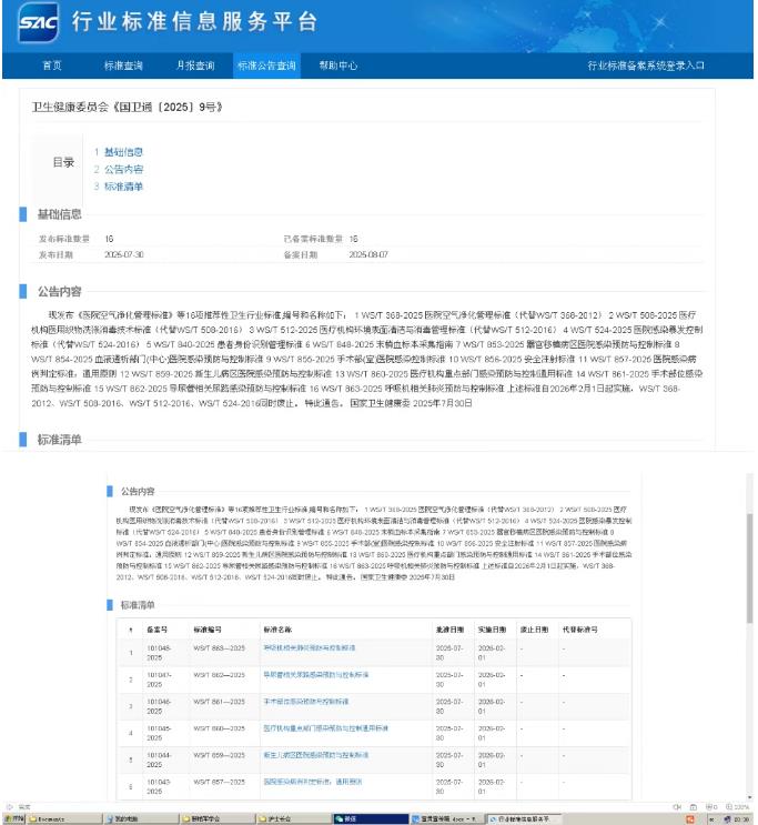 國家衛生健康委員會近日正式發布《國衛通〔2025〕9號》公告,公布并備案了16項推薦性衛生行業標準,其中14項重點圍繞醫院感染控制領域。該批標準將于2026年2月1日起全面實施,同時,4項修訂前的舊版標準同步廢止。新標準的發布實施,對進一步規范醫院感染管理流程、提升醫療質量安全水平具有重要意義。