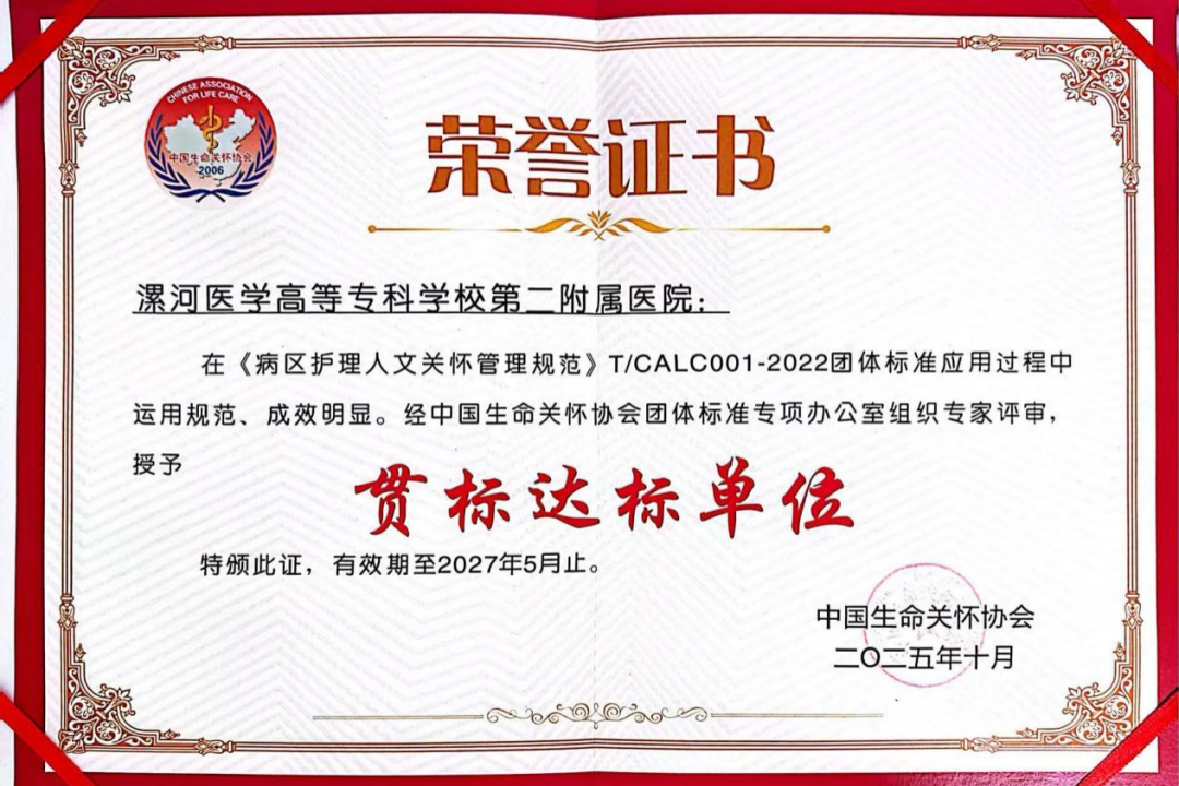 10月30日—11月2日,由國家生命關懷協會主辦、華中科技大學同濟醫學院附屬協和醫院承辦的國家級繼續教育項目“醫院護理人文關懷標準化建設”會議在武漢召開。此次大會以“關懷實踐 標準引領”為主題,匯聚了來自29個?。ㄊ?、自治區)的護理界領導與專家,共同探討與展示醫學人文關懷標準化建設的前沿理論與實踐成果。在備受矚目的授牌儀式環節,大會正式公布了《病區護理人文關懷管理規范》團體標準第二批貫標驗收評審結果,并現場為達標單位授牌、頒發證書。漯河醫專二附院(漯河市骨科醫院、漯河市立醫院)憑借在人文護理領域扎實的工作成效和卓越的服務水平,成功通過評審,被正式授予“《病區護理人文關懷管理規范》團體標準貫標達標單位”。