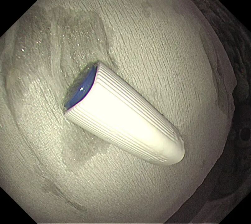 時間不等人,雖已臨近晚7點,市二院第一時間啟動應急響應機制,內鏡室、麻醉科醫護技立即返崗就位,并經院辦等職能部門積極協調,盡可能縮短術前準備時間,迅速制定了取出異物的方案。隨后,在全身麻醉下,朗朗安然入睡,醫生通過纖細的胃鏡,精準地找到了那個“惹事”的筆帽位于十二指腸內,并順利將其取出。整個過程僅用時十幾分鐘,朗朗術后很快蘇醒,觀察無礙后平安回家。