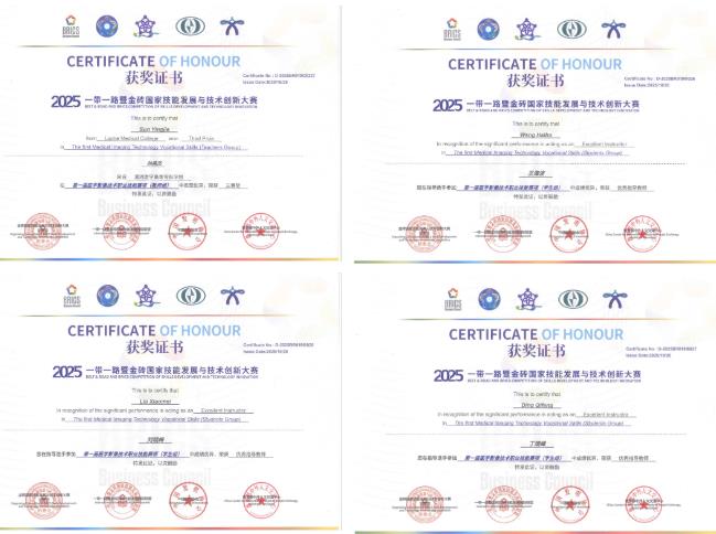 學校代表隊憑借扎實的專業知識、嫻熟的操作技能和穩定的賽場發揮,在多個賽項中表現搶眼:胡巧同學在“醫學圖像后處理”賽項中勇奪一等獎;皇巧梅同學在“CT檢查技術及診斷”賽項中同樣摘得一等獎;仝鑫琦同學在“X攝影檢查及診斷”賽項中獲二等獎;李印同學在“超聲檢查技術”賽項中獲三等獎。