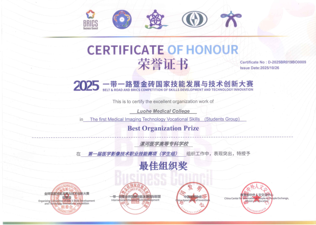 10月23日至26日,2025“一帶一路”暨金磚國家技能發展與技術創新大賽——醫學影像技術職業技能賽項在北京衛生職業學院舉行。醫學影像團隊在周山主任帶領下,與來自全國61所職業院校的優秀師生同場競技,師生團隊奮勇爭先、發揮出色,在所有學生實踐技能比賽及教師教學比賽中均獲優異獎項。