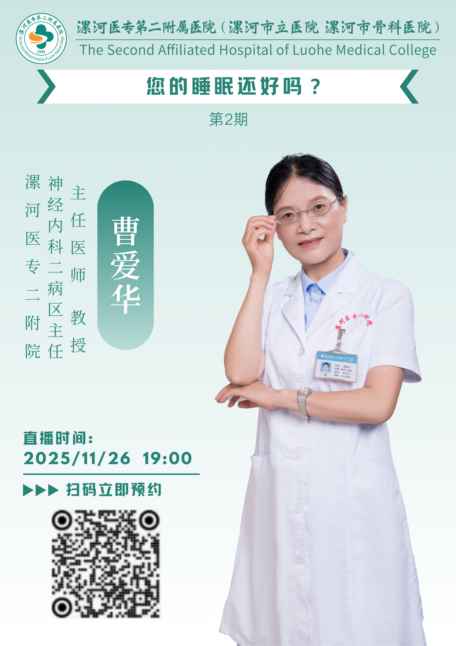 直播預告|漯河醫專二附院健康科普“云直播”第二期 您的睡眠還好嗎? “您的睡眠還好嗎?”11月26日(周三)晚7點,漯河醫專二附院(漯河市骨科醫院、漯河市立醫院)健康科普“云直播”,邀請漯河市睡眠醫學中心負責人、漯河醫專二附院神經內科二病區主任曹愛華教授與您共話健康睡眠,敬請關注!