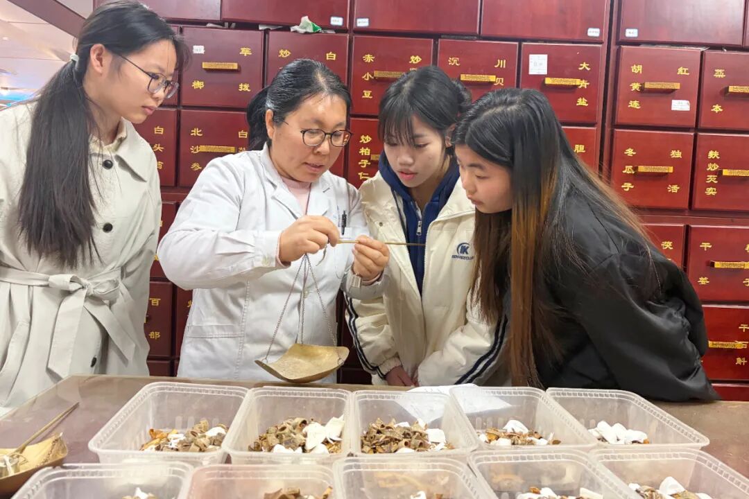 在市中醫院藥學部副主任白冰、陳志軍陪同下,師生們先后走進精品藥房、散裝飲片藥房、西藥房、制劑藥房、藥庫及臨床藥學室。從貴細藥材的鑒別儲存、“戥子稱量”的傳統技藝,到現代化藥房的高效管理、臨床藥師的一線用藥案例,同學們沉浸式感受了從傳統中醫藥到現代藥學服務的魅力。