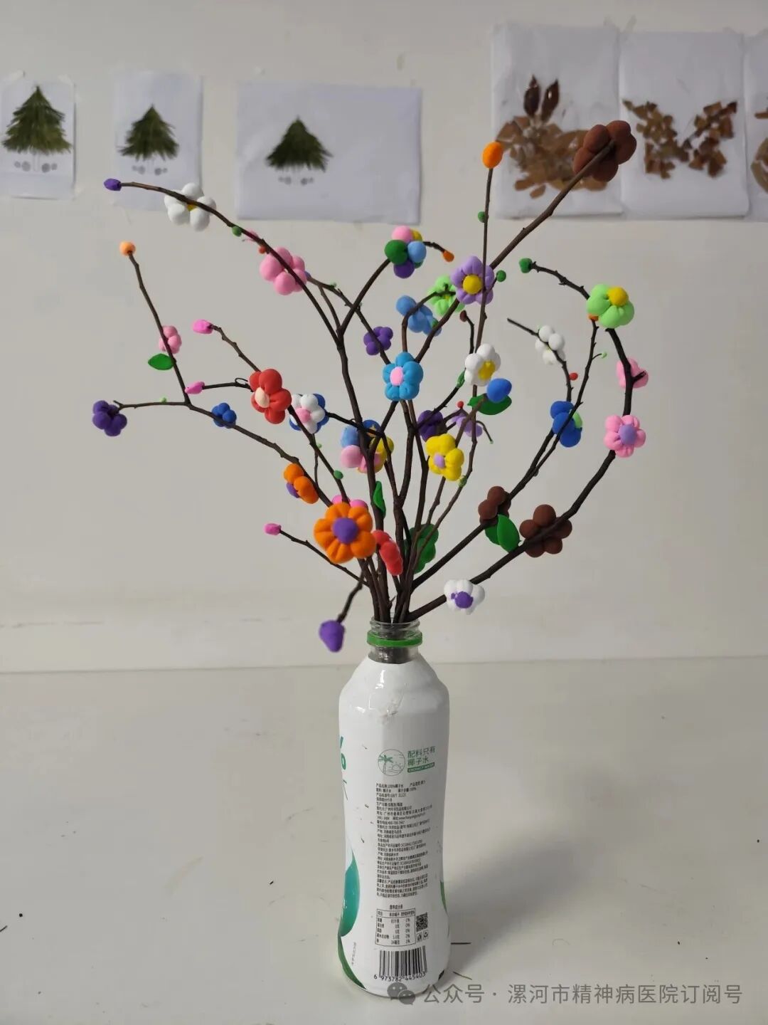 12月1日,漯河市精神病醫院心身醫學科的活動室,有點不一樣,沒有復雜的工具,只有幾包彩色粘土、撿來的枯樹枝,還有一群帶著期待的患者。醫護人員要做的,是把“春天”捏進枯枝里,裝在喝完的飲料瓶里~