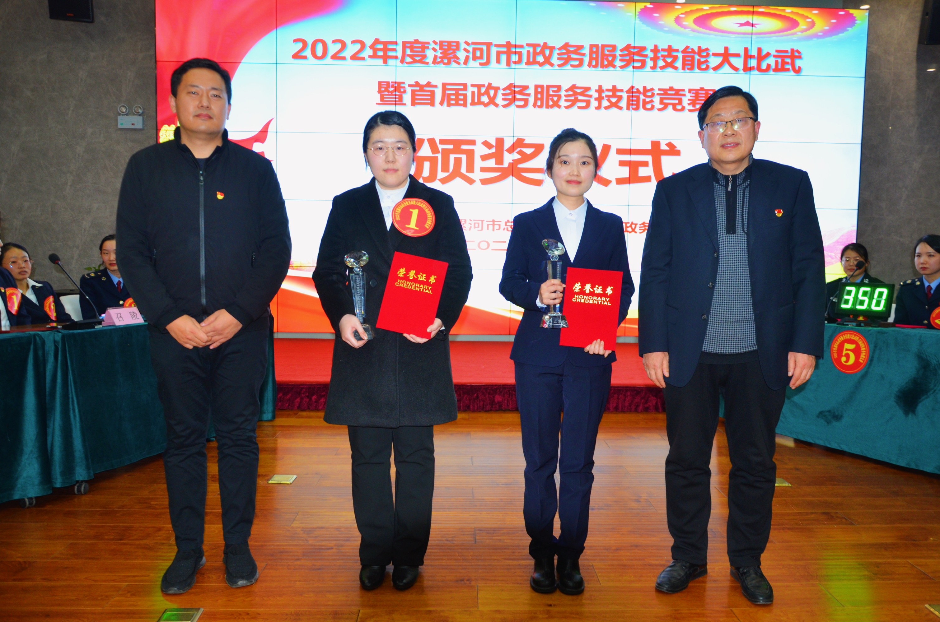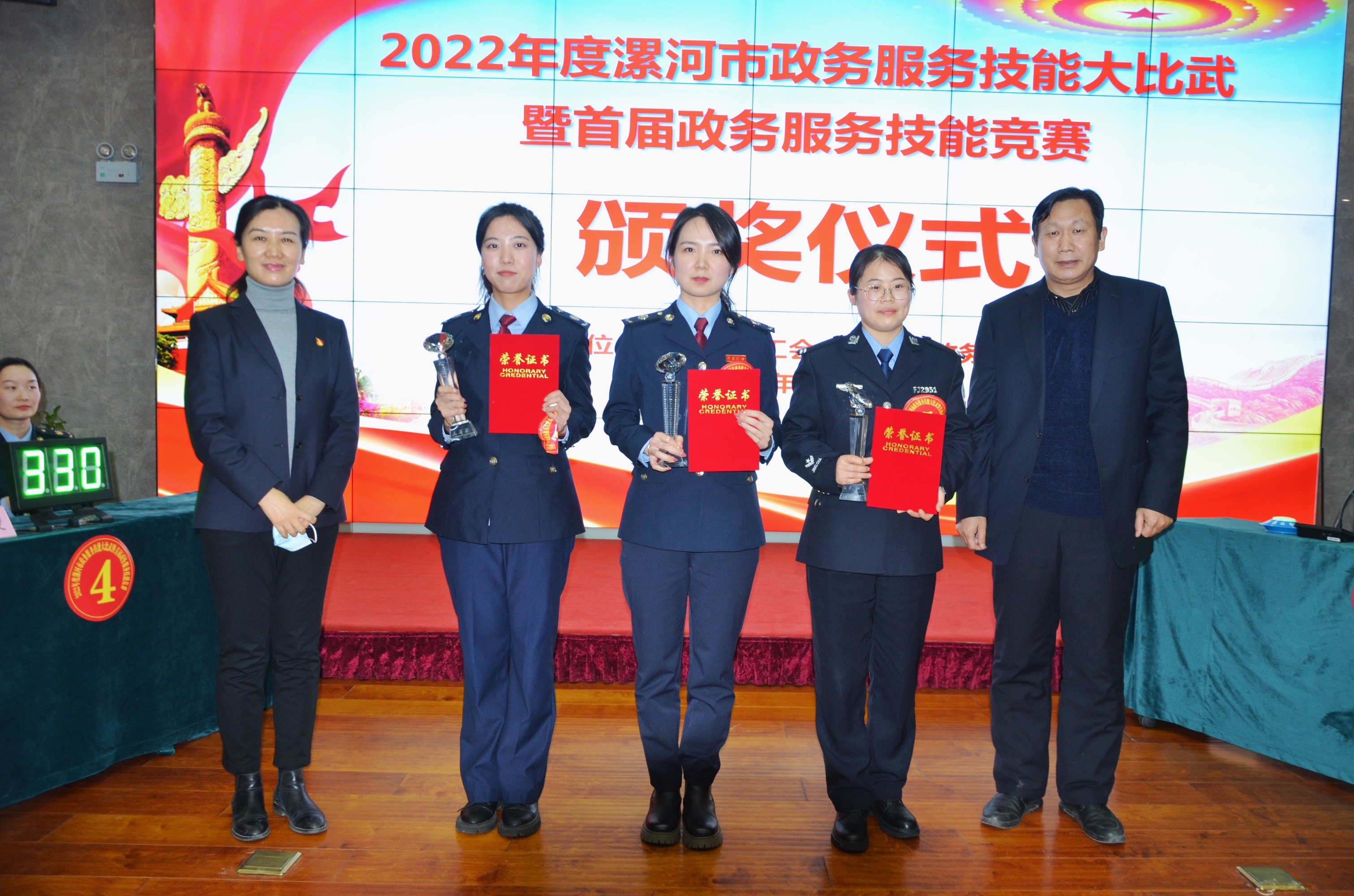 比賽中,各參賽代表隊奮勇爭先、激烈角逐;各參賽隊員在賽場上互相配合,充分發揮出團隊的作用。最終,舞陽縣行政服務中心代表隊獲得團體一等獎,張小麗同志獲得個人一等獎;召陵區行政服務中心、市政務服務中心人社公安稅務聯合隊2個代表隊獲得團體二等獎,孟希瑞、黃丹2名同志獲得個人二等獎;郾城區行政服務中心、臨潁縣行政服務中心、經濟技術開發區行政服務中心、3個代表隊獲得團體三等獎,劉玉、劉暢、范亞男3名同志獲得個人三等獎;舞陽縣行政服務中心、經濟技術開發區行政服務中心、市政務服務中心不動產登記窗口3個代表隊獲得優秀組織獎,本次總決賽還設置了團體優秀獎和個人優秀獎若干。評委會成員為獲得獎項的代表隊和參賽隊員頒獎。