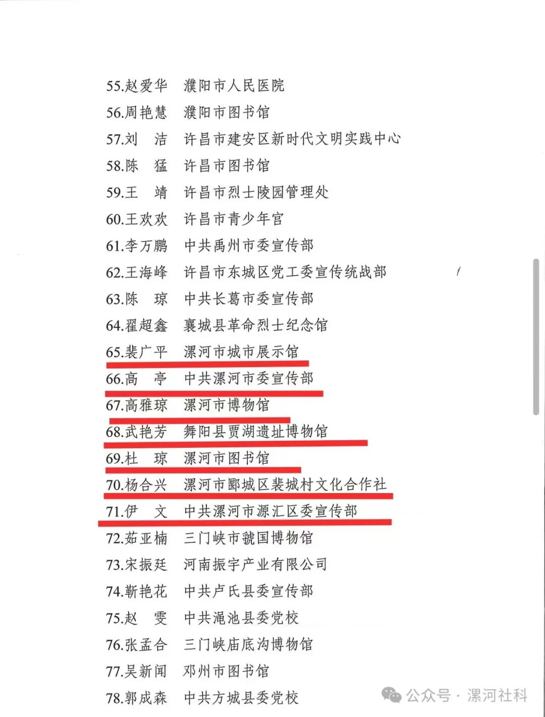 2024年社科普及志愿服務活動表現突出社科普及指導員(7名):裴廣平(漯河市城市展示館);高亭(中共漯河市委宣傳部);高雅瓊(漯河市博物館);武艷芳(舞陽縣賈湖遺址博物館);杜瓊(漯河市圖書館);楊合興(漯河市郾城區裴城村文化合作社);伊文(中共漯河市源匯區委宣傳部)