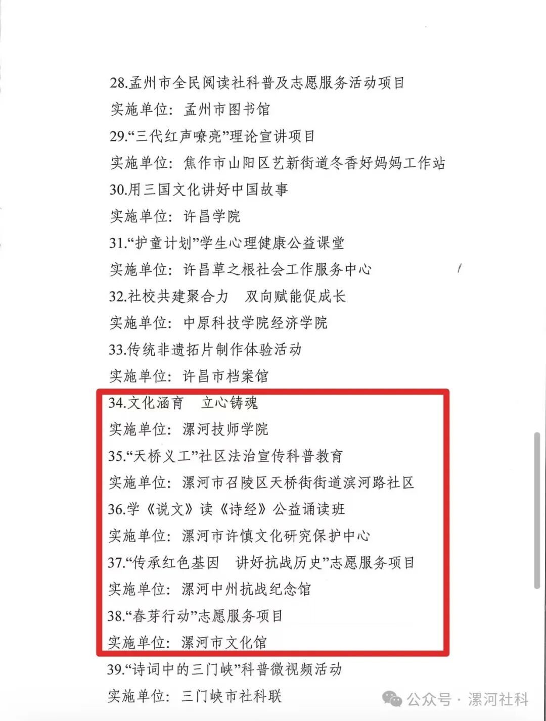 2024年表現突出社科普及志愿服務活動項目(5個):文化涵育 立心鑄魂(實施單位:漯河技師學院);“天橋義工”社區法治宣傳科普教育(實施單位:漯河市召陵區天橋街街道濱河路社區);學《說文》讀《詩經》公益誦讀班(實施單位:漯河市許慎文化研究保護中心);“傳承紅色基因 講好抗戰歷史”志愿服務項目(實施單位:漯河中州抗戰紀念館);“春芽行動”志愿服務項目(實施單位:漯河市文化館)