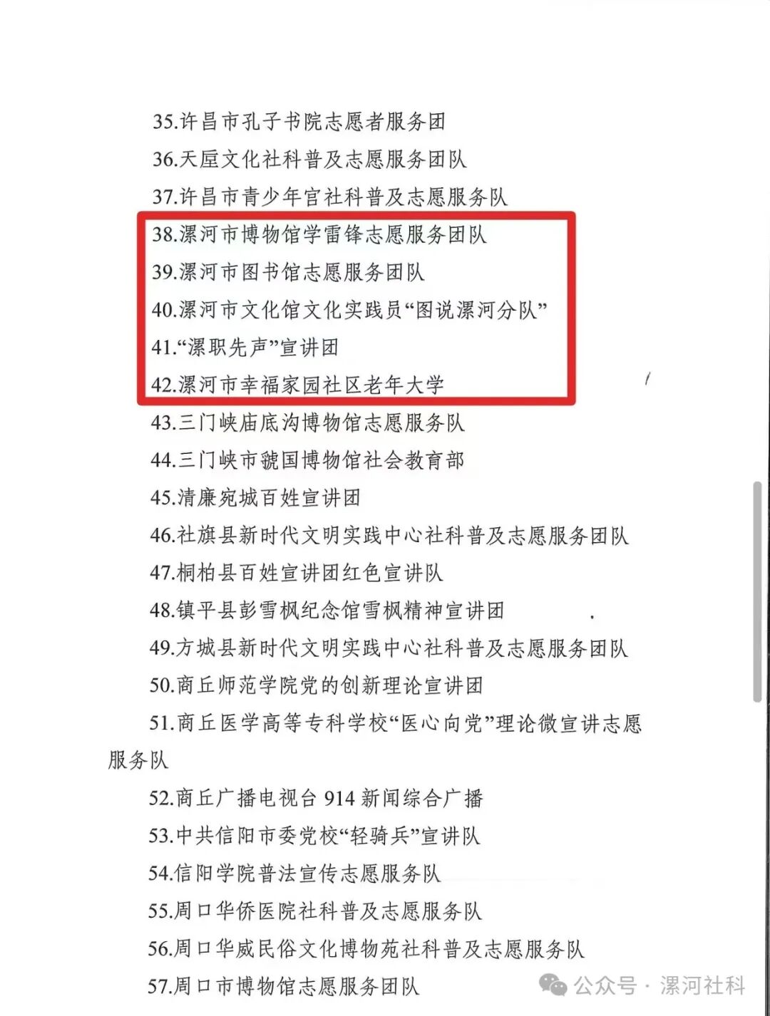 2024年社科普及志愿服務活動表現突出社科普及志愿服務團隊(5個):漯河市博物館學雷鋒志愿服務團隊;漯河市圖書館志愿服務團隊;漯河市文化館文化實踐員“圖說漯河分隊”;“漯職先聲”宣講團;漯河市幸福家園社區老年大學