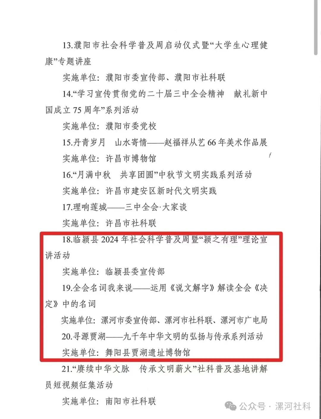 2024年河南省社科普及周活動表現突出特色活動(3個):臨潁縣2024年社會科學普及周暨“潁之有理”理論宣講活動(實施單位:臨潁縣委宣傳部);全會名詞我來說——運用《說文解字》解讀全會《決定》中的名詞(實施單位:漯河市委宣傳部、漯河市社科聯、漯河市廣電局);尋源賈湖——九千年中華文明的弘揚與傳承系列活動(實施單位:舞陽縣賈湖遺址博物館)
