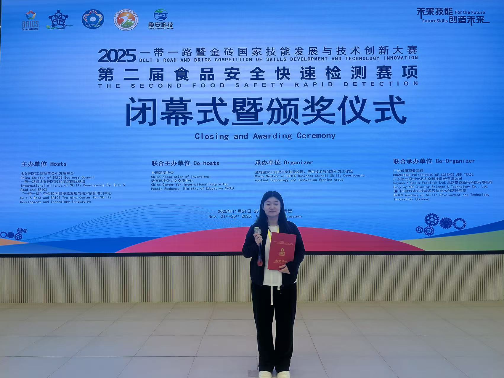 近日,2025“一帶一路”暨金磚國家技能發展與技術創新大賽“食品安全快速檢測賽項”全國總決賽在廣東科貿職業學院落下帷幕。漯河醫學高等??茖W校(以下簡稱“漯河醫專”)公共衛生與健康營養學院教師陳沖憑借扎實的專業知識和精湛的實踐操作能力,在教師賽中脫穎而出,榮獲二等獎,充分展現了學校在食品安全快速檢測領域的教學實力與人才培養質量。