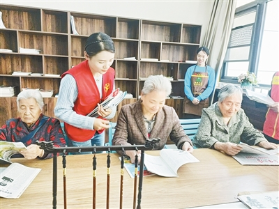 老人們在干河陳街道綜合養老服務中心讀書看報。