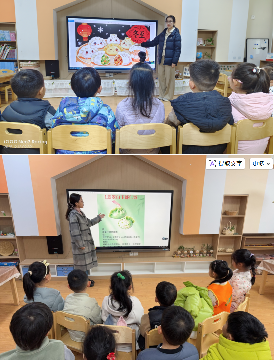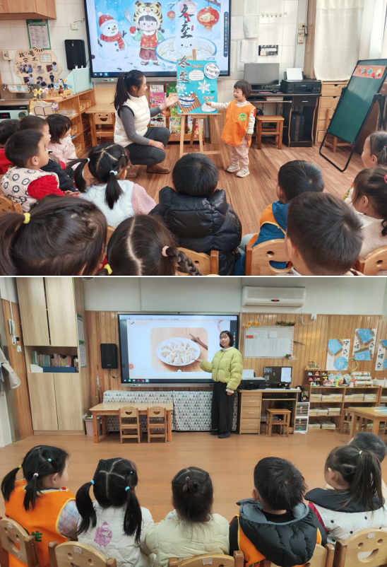 保健醫也走進了大班課堂,將冬至文化知識與幼兒健康養護巧妙融合。立足幼兒冬季保健需求,保健醫具體示范“洋蔥式穿衣法”,強調飲食多樣與營養均衡,引導幼兒在了解習俗的同時,建立科學防寒、健康飲食的自我防護意識,讓傳統文化承載著關愛與智慧浸潤童心。