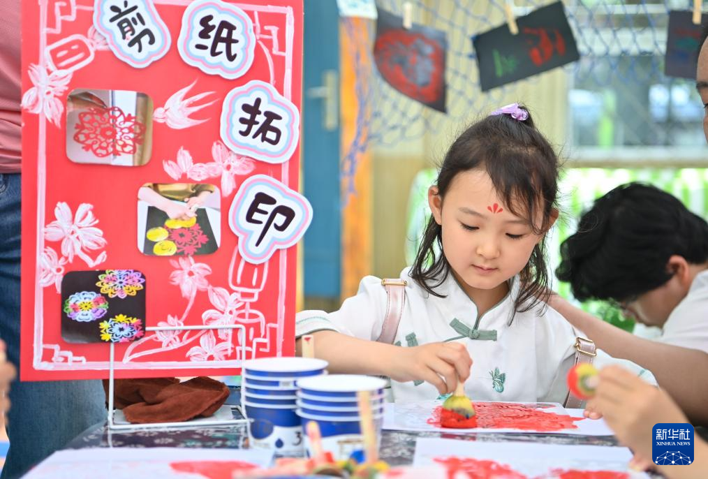 5月30日,山西省太原市迎澤區師苑幼兒園的小朋友在慶祝“六一”主題活動中體驗剪紙拓印。